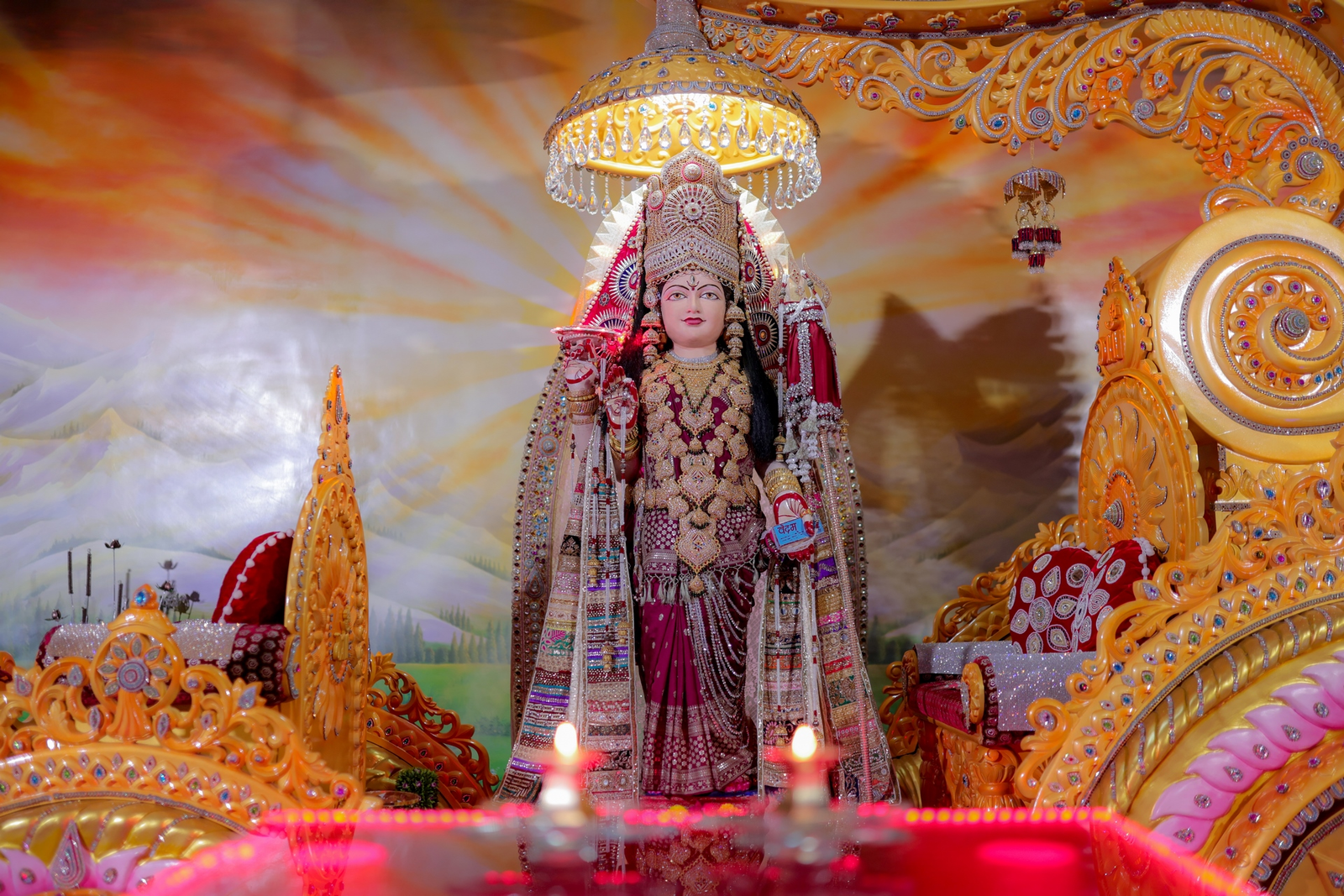 Mother VISHVAMBHARI is the creator of this endless Universe and entire world. Mother created Brahma, Vishnu and Mahesh (three Lords) and she is also the creator of minutest lifes to the gigantic animals; small mote to skyward ranges of Himalayas; small drop of water to seven seas; skies covering little cloud to stars, planets and nebulas. By arranging mysterious play of evolution, she has created special niche for humans and given the super most position to human beings in this world. So that he/she can attain the self-emancipation by singing lyrics of her Extra-terrestrial power. Mother VISHVAMBHARI is the mother of all Gods and Goddesses. She is omnipresent, almighty and omniscient.
